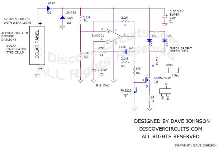 The circuit design below is used to flash two bright, wide-angle LEDs. The energy required for flashing comes from diffused light available in the commercial store. A six-volt solar panel on top of the flasher assembly converts some of the light hitting the solar panel into electrical energy, charging a supercapacitor. The supercapacitor provides the peak current required to flash the two LEDs. A constant current LED driver is used. The two LEDs are connected in parallel. Each receives approximately 10 mA of current for 20 milliseconds. The flashing rate is once per second. Therefore, the average current is approximately 400 microamps.